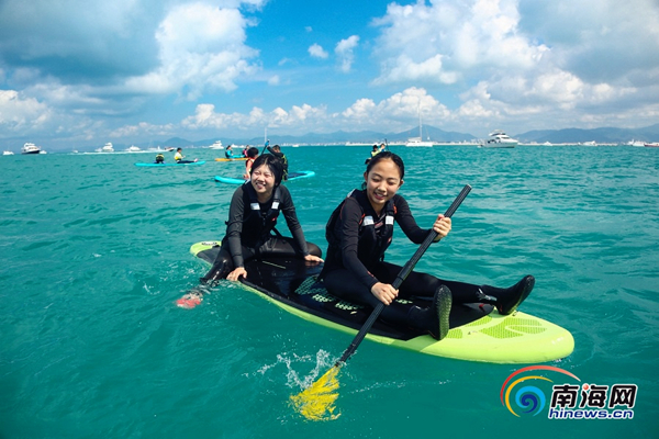 Students experience paddle boarding in Sanya. [Photo by Wu Wei/hinews.cn]