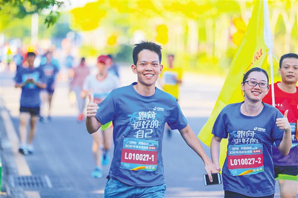 A couple runs hand in hand during the running activity in Qionghai. [Photo by Zhang Mao/Hainan Daily]