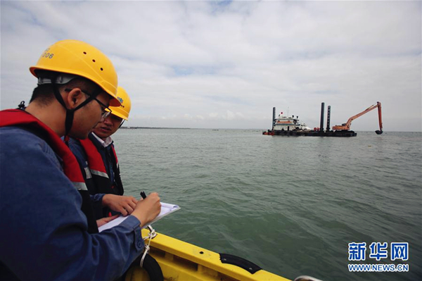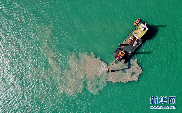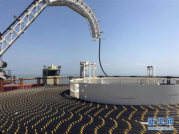 Cable laying vessel works for Hainan's second submarine power channel. [Photo by Zhang Liyuan/news.cn]
