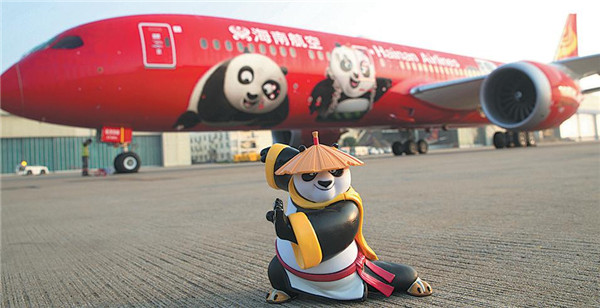 A direct flight from Chengdu to Los Angeles is painted with a picture of Kung Fu Panda at the Chengdu Shuangliu International Airport in Chengdu. BAI GUIBIN / FOR CHINA DAILY